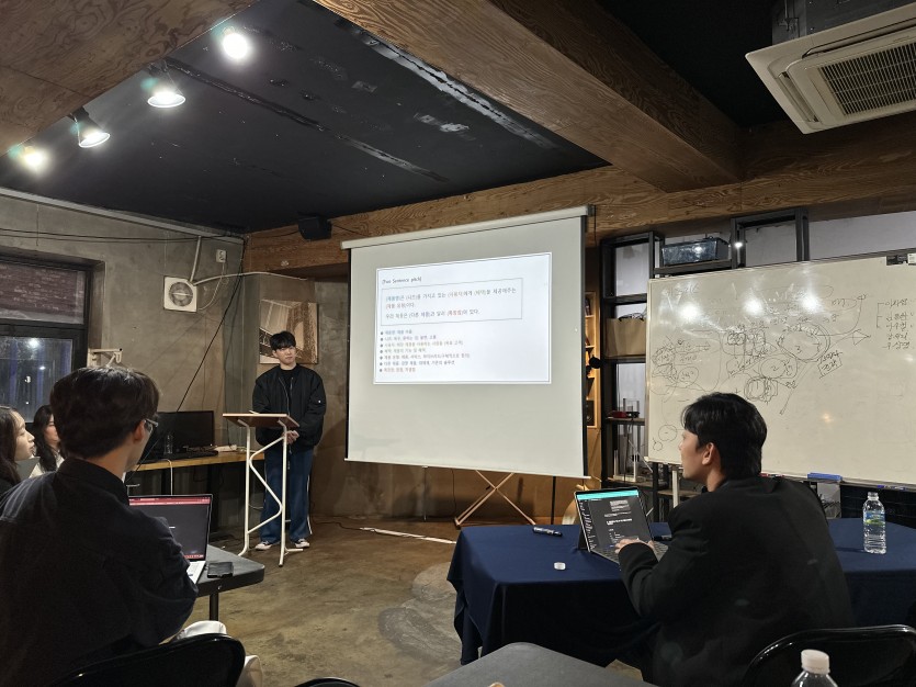 참가자들은 각자 자신의 아이템을 ‘두 문장(Two Sentences)’으로 정리해 발표하는 실습을 진행했고, 이후 해당 문장을 기반으로 발표 내용에 대한 피드백과 보완 전략을 공유받았다. 이는 향후 피칭 상황에 대비한 실전 훈련으로, 일부는 AI 도구를 활용한 문장 보완 방법도 익혔다.